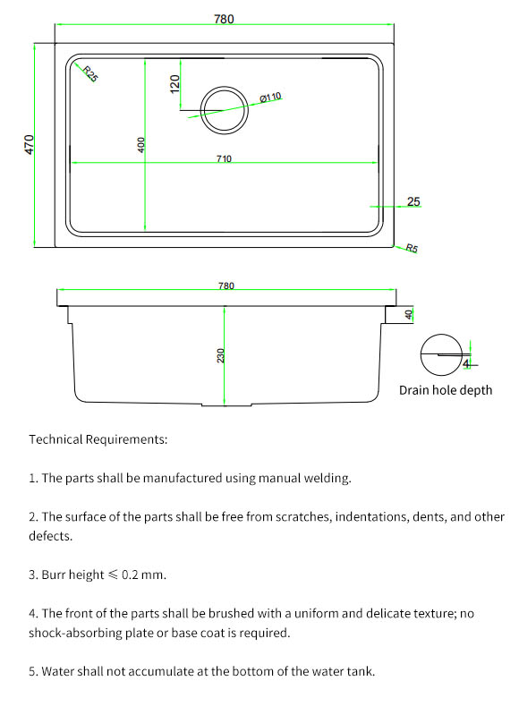 The core advantages of an R25 right-angle sink (actually a small radius corner design) are higher space utilization and better cleaning convenience, balancing practicality and aesthetics, and made of 304 stainless steel. Features Overview: R25 refers to a 25mm radius of curvature at the sink corner, considered a "small radius corner" in the industry.