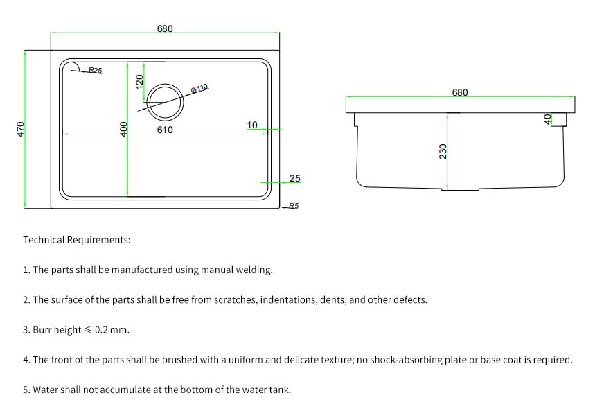 The core advantages of an R25 right-angle sink (actually a small radius corner design) are higher space utilization and better cleaning convenience, balancing practicality and aesthetics, and made of 304 stainless steel. Features Overview: R25 refers to a 25mm radius of curvature at the sink corner, considered a "small radius corner" in the industry.