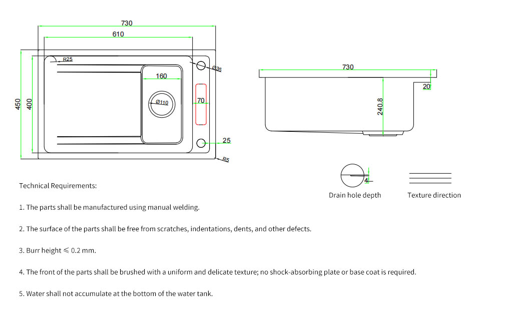 The core advantages of an R25 right-angle sink (actually a small radius corner design) are higher space utilization and better cleaning convenience, balancing practicality and aesthetics, and made of 304 stainless steel. Features Overview: R25 refers to a 25mm radius of curvature at the sink corner, considered a "small radius corner" in the industry.